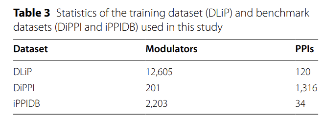 最终两个基准集的具体情况如下:DiPPI 包含 201 种调节剂,对应 1,316 个 PPIs 靶点,每个样本都有分子结构、蛋白序列、界面结构和活性标签;iPPIDB 则涵盖 2,203 种调节剂和 34 种 PPIs,所有蛋白序列都来自 UniProt 数据库,保证了数据一致性。
