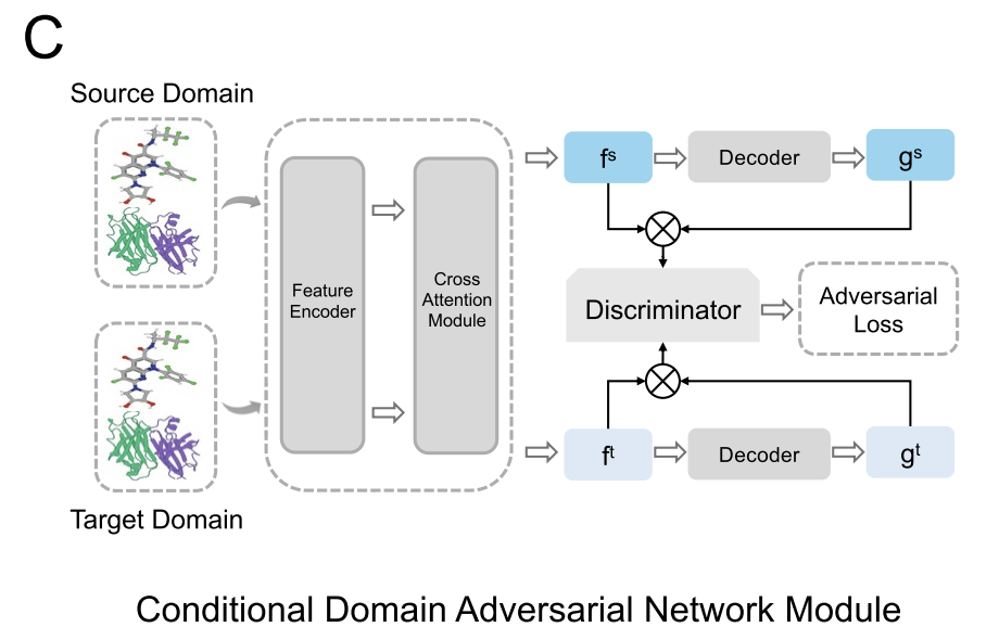考虑到不同数据集的特征分布存在差异,比如 DiPPI 主要关注界面靶向调节剂,而 DLiP 这类通用数据集却缺乏此类信息,如下图所示,AlphaPPIMI 还引入了条件域对抗网络(CDAN,Conditional Domain Adversarial Network)。 CDAN 以「特征嵌入与分类预测的联合表征」作为域判别器的条件,既能保留有判别价值的特征,又能实现源域与目标域间的分布对齐。训练过程采用极小极大博弈:特征提取器(Feature Encoder)和交叉注意力模块负责生成域不变表征,鉴别器则用来区分特征的来源。这一机制大幅提升了模型在不同蛋白质家族间的泛化能力,为识别新颖的界面靶向调节剂提供了更稳健的支持。