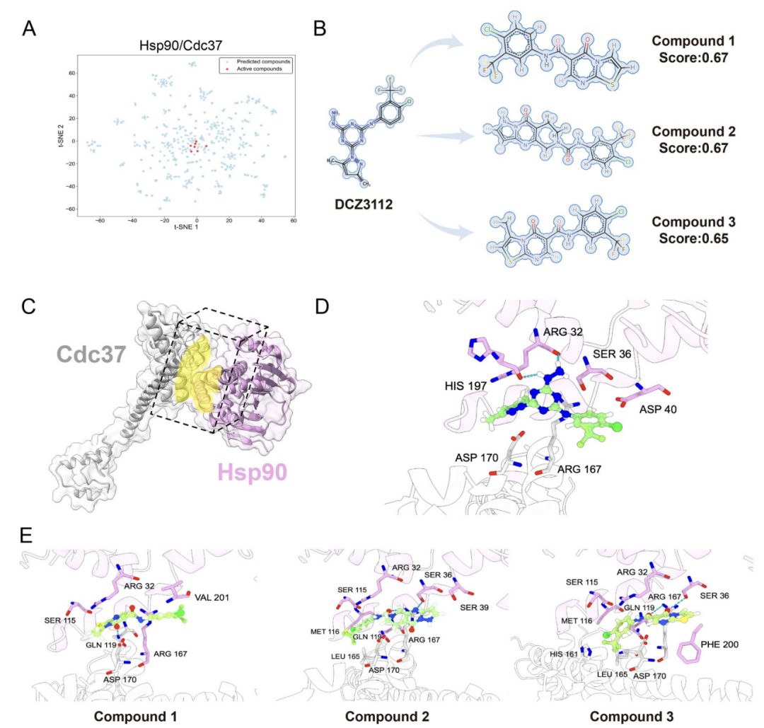 在实际应用验证中,该研究还以界面结构明确且为抗癌关键靶点的 Hsp90-Cdc37 PPIs 为对象,如下图 A 所示,AlphaPPIMI 筛选 ChemDiv 库中预测分数>0.8 的化合物,其化学空间与已知活性抑制剂分布接近;如下图 B 所示,研究人员以已验证抑制剂 DCZ3112 为参考,经结构相似性与药效团分析筛选出 3 个候选化合物;如下图 D–E 所示,分子对接显示这些化合物可与 Arg32 、 Ser36 等关键残基形成类似参考分子的相互作用,提升其抑制剂潜力。