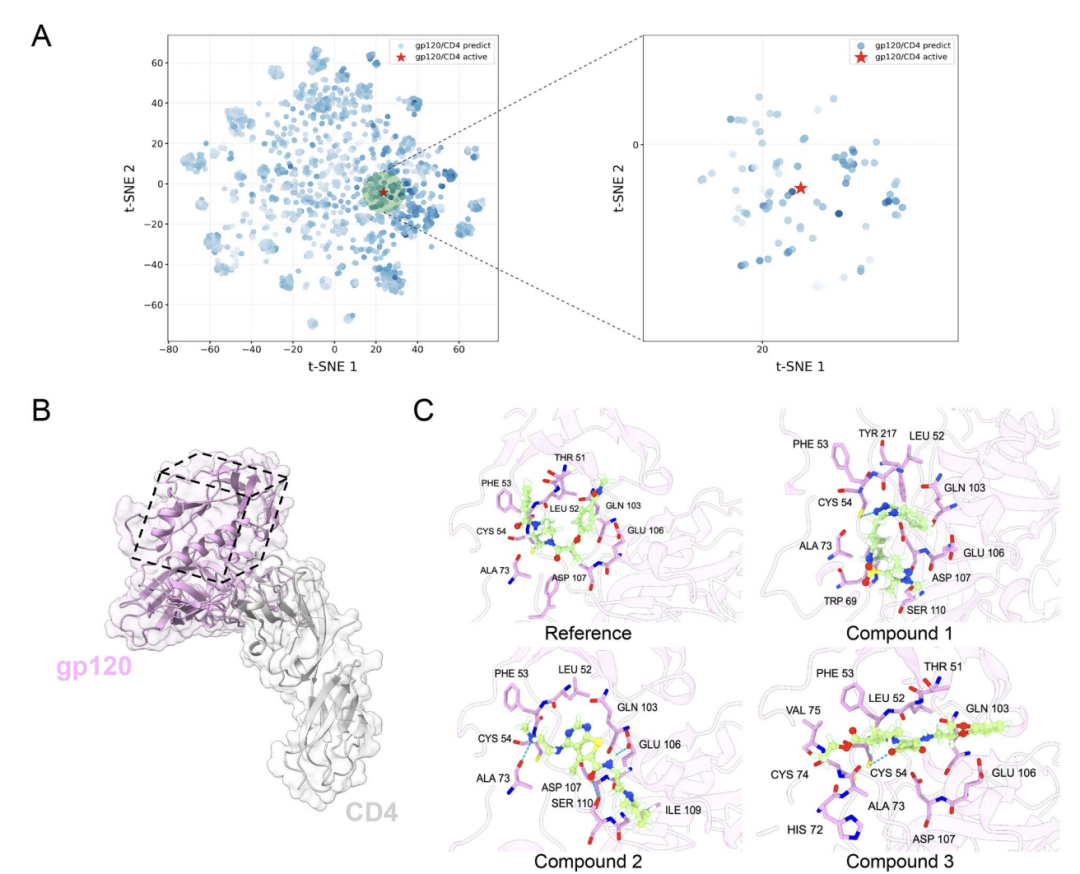 针对 AlphaPPIMI 在筛选变构 PPIs 调节剂中的应用,如下图 A 所示,研究人员以 HIV-1 gp120 与 CD4 的相互作用为例,AlphaPPIMI 筛选出预测概率>0.8 的化合物,其化学空间与已知活性抑制剂重叠度高;如下图 B-C 所示,基于非典型界面结构(PDB: 6L1Y)的分子对接结果显示,候选化合物可与 THR51 、 LEU52 、 PHE53 等关键残基相互作用,表明 AlphaPPIMI 可发掘针对难成药 PPIs 界面的别构型抑制剂,为相关药物开发提供新途径。
