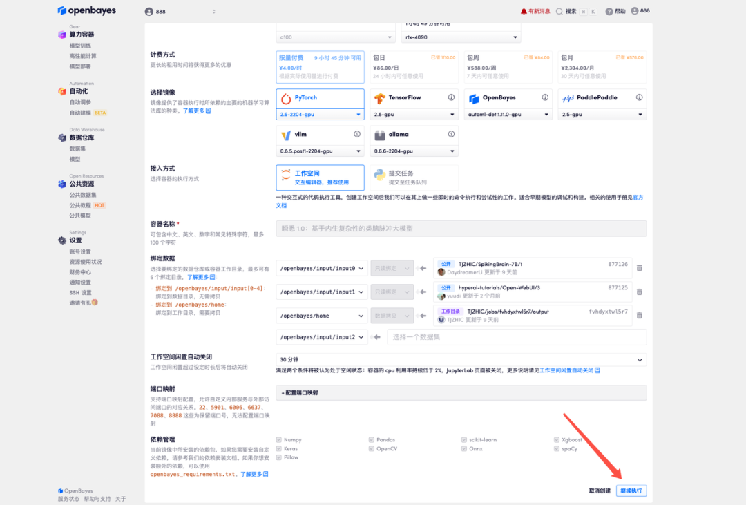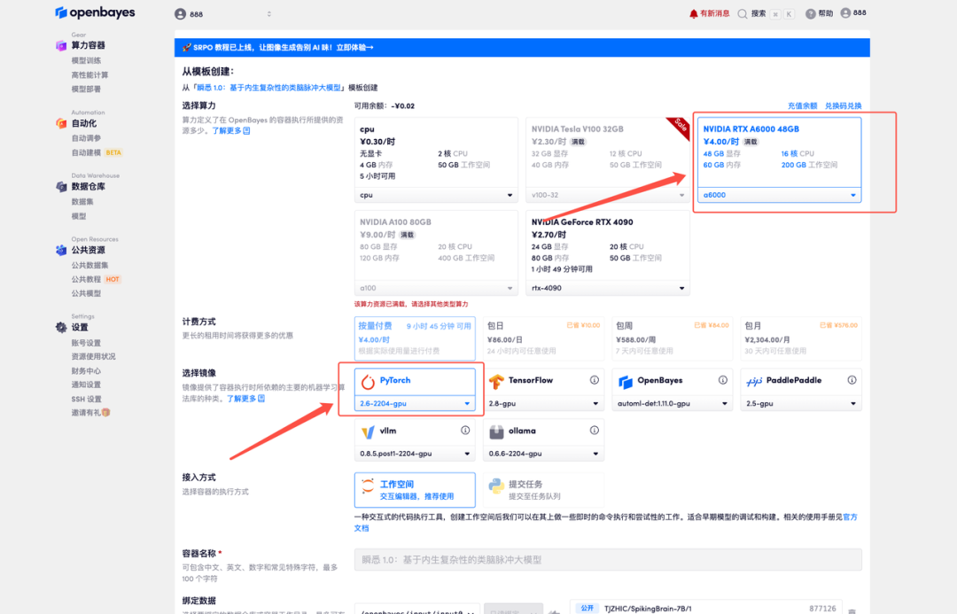 3. 选择「NVIDIA RTX A6000 48GB」以及「PyTorch」镜像,并点击「继续执行」。 OpenBayes 平台提供了 4 种计费方式,大家可以按照需求选择「按量付费」或「包日/周/月」。新用户使用下方邀请链接注册,可获得 4 小时 RTX 4090 + 5 小时 CPU 的免费时长!