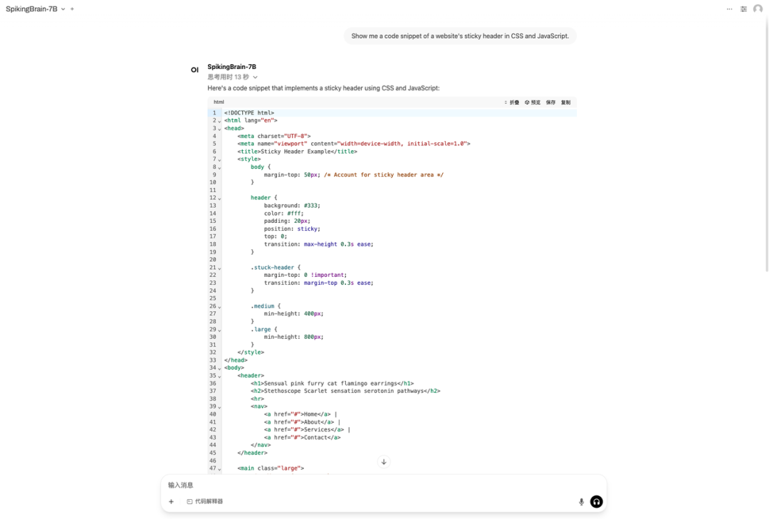 笔者以「Show me a code snippet of a website’s sticky header in CSS and JavaScript.」为例进行提问,效果如下图所示: