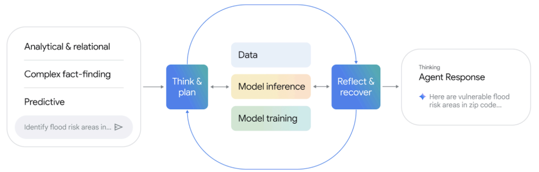 为解决复杂多步骤地理空间问题,Earth AI 开发了 Gemini 驱动的地理空间推理 Agent,该 Agent 依托 Google Agent 开发工具包(ADK),整合通用推理能力与影像分析、人口统计、环境模拟、时空建模四大专业功能,并配套地理空间数据处理、代码生成、 Earth Engine 数据访问等工具。