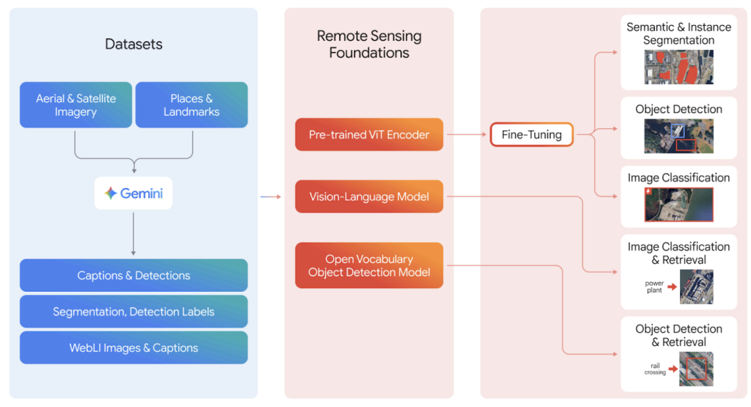 Earth AI 在影像分析领域以遥感基础模型为核心,核心目标是解决遥感数据中普遍存在的标注稀缺与图像分布特殊两大关键挑战,为地球观测场景的高效语义理解与目标分析提供技术支撑。如下图所示,该模型从谷歌地图中提取专业航空/卫星图像,结合地点、地标等地理空间元数据输入 Gemini 模型,通过定制化提示生成与影像内容精准匹配的合成字幕;同时整合带文本注释的 WebLI 遥感图像,以及经过人工标注的遥感分割与目标检测数据集。这些多源数据共同为三类核心模型的预训练提供高质量样本支撑,分别是预训练 ViT 编码器(Pre-trained ViT Encoder)、视觉语言模型(Vision-Language Model, VLM)与开放词汇目标检测模型(Open Vocabulary Object Detection Model, OVD)。