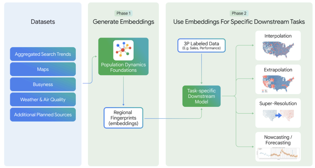 在人口分析方面,Earth AI 以人口动态基础模型为核心,遵循多源信息融合与隐私保护原则,整合建筑环境、自然条件、人类行为数据,通过图神经网络生成统一区域嵌入(Regional embeddings)。
