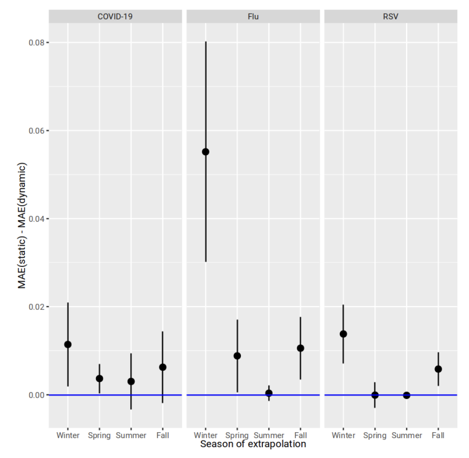 人口动态基础模型在空间插值与时间预测任务中展现出强劲性能。如下图所示,其全球嵌入在预测 20% 区域缺失变量的任务中保持稳定的 R² 表现,并在跨国家泛化测试中验证了良好的迁移能力。基于 2023 年 7 月起构建的月度动态嵌入,在 COVID-19 与流感急诊就诊人次的外推预测中,其平均绝对误差显著低于静态嵌入,尤其在秋冬季疾病高发期优势更为明显。第三方验证进一步确认了该模型在真实场景中的适用性与鲁棒性。