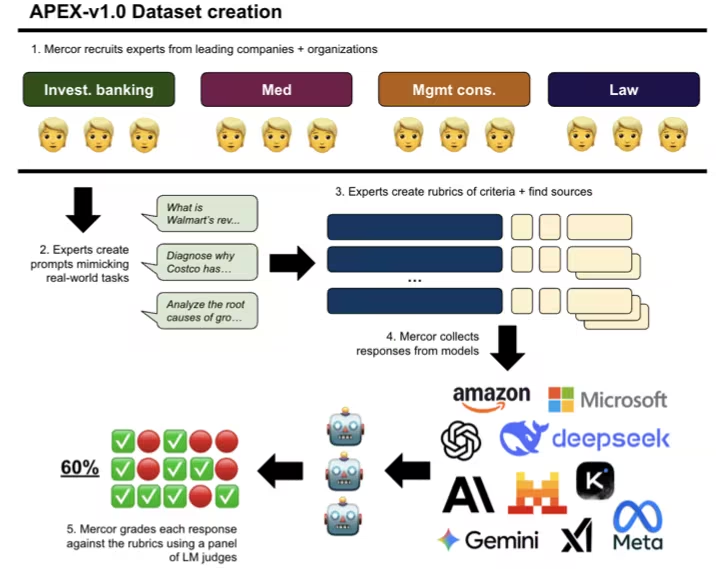 APEX 是由 Mercor 研究团队联合哈佛大学法学院、斯克里普斯研究所首次发布的一个用于评估前沿人工智能模型在高经济价值知识工作中表现的综合性基准测试数据集,旨在衡量前沿人工智能模型在真实经济任务中的执行能力,而非仅停留于抽象推理层面。