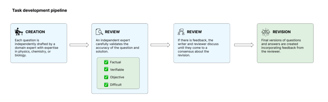 为确保问题的原创性和严谨性。研究团队在内部模型测试阶段对题目进行了筛选,并剔除已被现有模型轻易解决的问题,以降低评测饱和风险。训练任务总计会经历创建、审核、解决和修订 4 阶段,独立专家会相互审核各自的任务,以确保其符合标准。最终,团队从数百道候选问题中筛选出 160 道开源题目,其余题目则作为保留集,用于后续污染检测与长期评测。