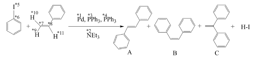 为验证 ChemOntology 框架在反应路径搜索中的有效性与效率,研究团队选取了机理复杂且具有代表性的经典 Heck 反应作为测试体系。如下图所示,该反应以碘苯和苯乙烯为底物,在钯催化、三苯基膦配体和三乙胺碱的条件下,主要生成反式二苯乙烯,并伴随少量顺式异构体及微量副产物。其机理涵盖氧化加成、烯烃插入、迁移插入、β-氢消除和碱消除等多个关键步骤,反应中心众多,对自动化路径搜索方法构成了典型挑战。