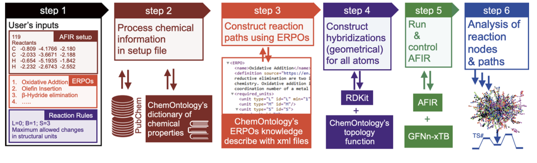 如下图所示,ChemOntology 的工作流程由用户输入解析(User’s inputs)、化学信息建模(Process chemical information in setup file)、反应路径生成(Construct reaction paths using ERPOs)、结构合理性约束(Construct hybridizations for all atoms)、运行并控制 AFIR(Run & control AFIR)以及路径分析(Analysis of reaction nodes & paths)等环节构成。