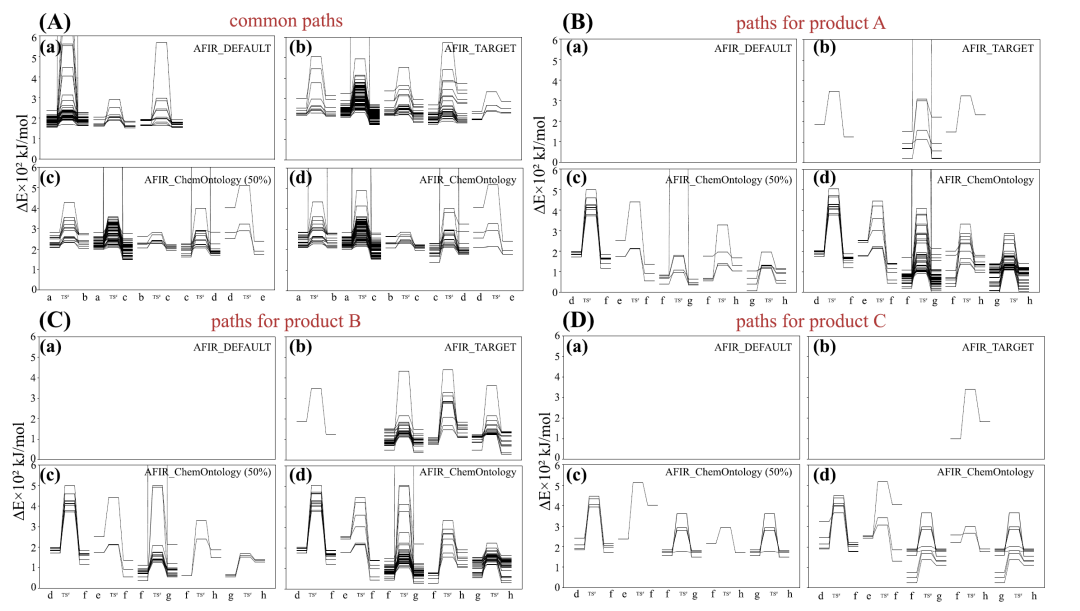 研究中对比了三种并行的路径搜索策略:无引导的 AFIR_DEFAULT 、部分限定反应中心的 AFIR_TARGET,以及引入化学本体论的 AFIR_ChemOntology 。三者在搜索「智能化」程度上存在本质差异:前者几乎不加区分地遍历构型空间,后者通过人为约束缩小搜索范围,而 AFIR_ChemOntology 则由框架自动识别反应组分的化学角色与关键反应中心,并借助基元反应过程对搜索进行动态引导。