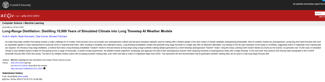 相关研究成果以「Long-Range Distillation: Distilling 10,000 Years of Simulated Climate into Long Timestep AI Weather Models」为题,已发表于 arXiv 。