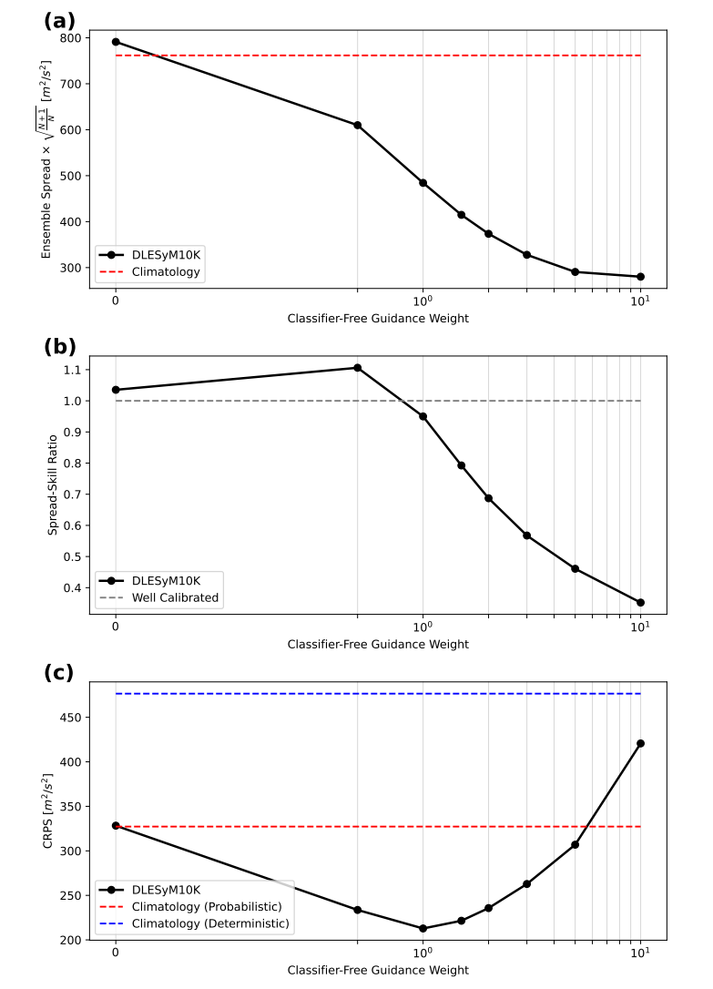 为精确校准概率预报的不确定性,本研究创新性地引入了「无分类器引导(Classifier-Free Guidance)」,允许在模型推理阶段通过调节一个简单的权重参数,灵活控制预报集合的离散度,使其与预报误差达到最佳平衡,从而便捷地生成校准良好的概率预报。