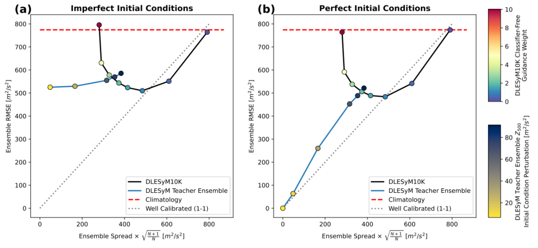在评估长距离蒸馏模型的跨时效集成预报能力时,该研究首先在受控的理想模型实验中进行验证。所有评估数据均取自自回归教师模型 DLESyM(Deep Learning Earth System Model)预留的模拟数据,且在蒸馏模型的训练过程中从未被使用。这一设置的核心目的,是检验在初始条件未完全确定的情况下,蒸馏长步长模型与 DLESyM 教师模型对未见模拟天气的预报表现,确保评估的客观性。