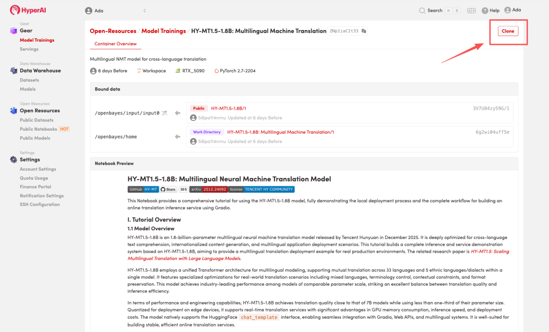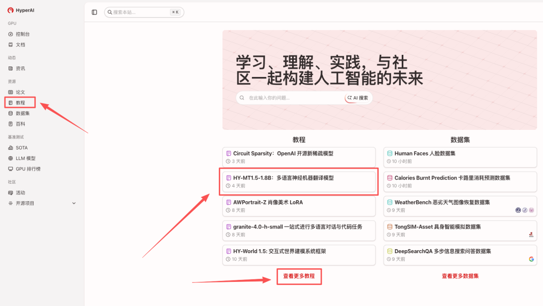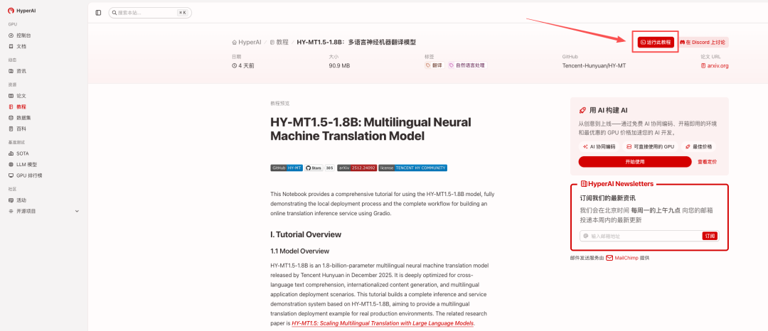 1. 进入 hyper.ai 首页后,选择「HY-MT1.5-1.8B:多语言神经机器翻译模型」,或进入「教程」页面选择。页面跳转后,点击「在线运行此教程」。