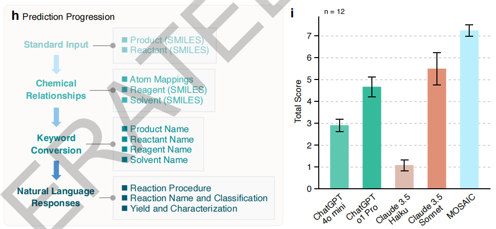 在 12 类重要反应(Suzuki 偶联、 Buchwald-Hartwig 胺化等)的对比测试中,如下图所示,与 ChatGPT-4o 、 Claude 3.5 等通用大语言模型相比,MOSAIC 在提供明确、可行的合成指导方面 consistently 表现更优。这一优势在模型参数量仅为 80 亿的背景下尤为突出,证明了领域专业化微调的有效性。更重要的是,MOSAIC 克服了通用模型在化学任务中常见的指令遵循不稳定、回答随意性大等问题,提供了稳定、可靠的输出,这对实际实验至关重要。