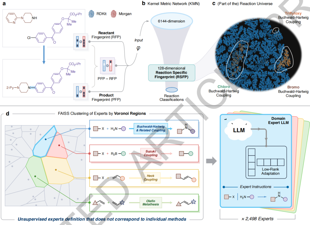 经过筛选的数据通过专门设计的核度量网络,被转化为 128 维的反应特异性指纹。该数字化表征旨在捕捉化学反应的本质转化特征,所有指纹向量共同构成了一个表征广阔化学知识空间的「反应宇宙」。基于此向量空间,研究采用无监督的 Voronoi 聚类算法(通过 FAISS 库实现),将其划分为 2,489 个互不重叠的专业区域,每个区域聚集了化学性质高度相似的反应类型。