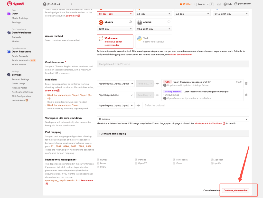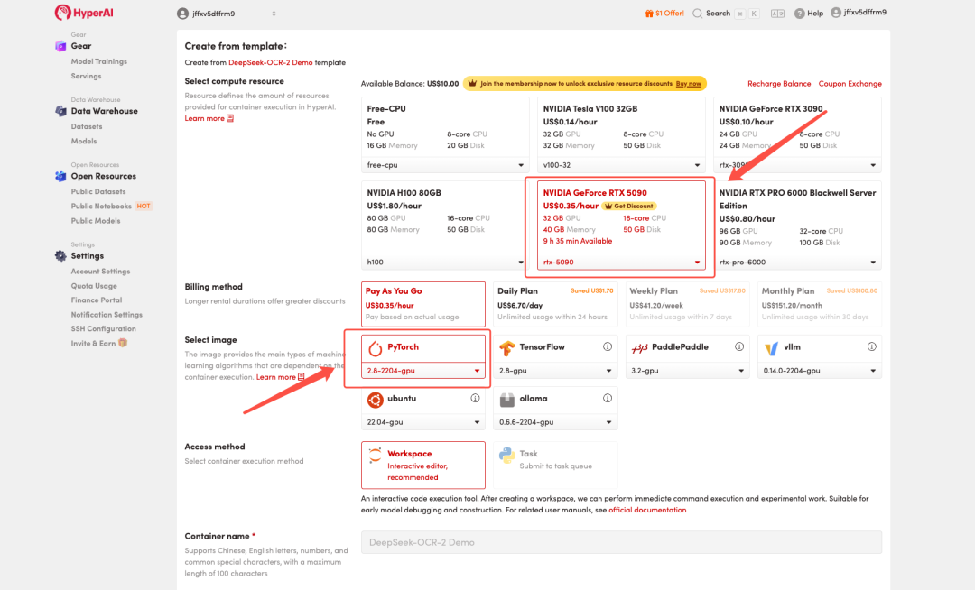 3. 选择「NVIDIA GeForce RTX 5090」以及「PyTorch」镜像,按照需求选择「Pay As You Go(按量付费)」或「Daily Plan/Weekly Plan/Monthly Plan(包日/周/月)」,点击「Continue job execution(继续执行)」。