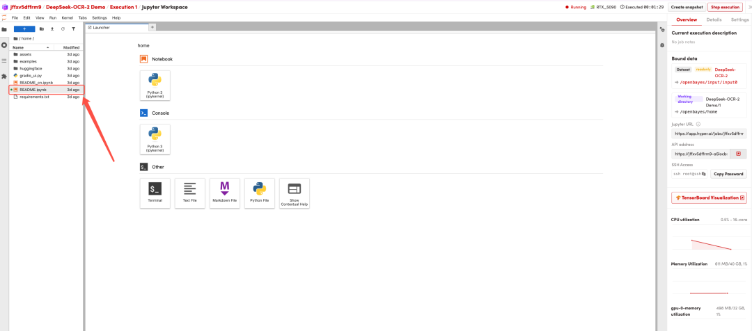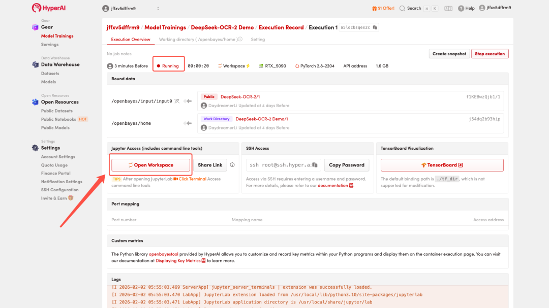 4. 等待分配资源,当状态变为「Running(运行中)」后,点击「Open Workspace」进入 Jupyter Workspace 。