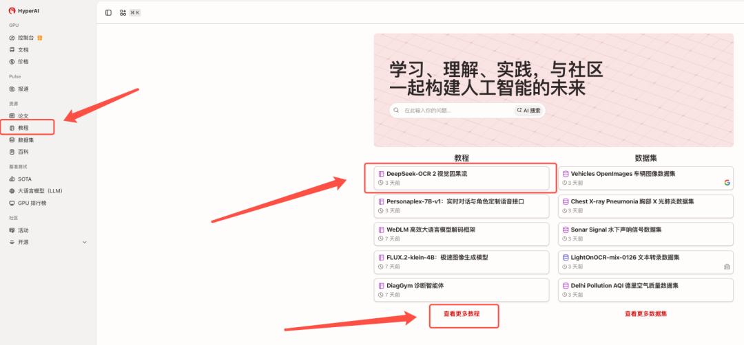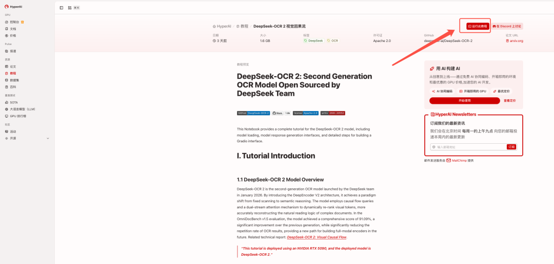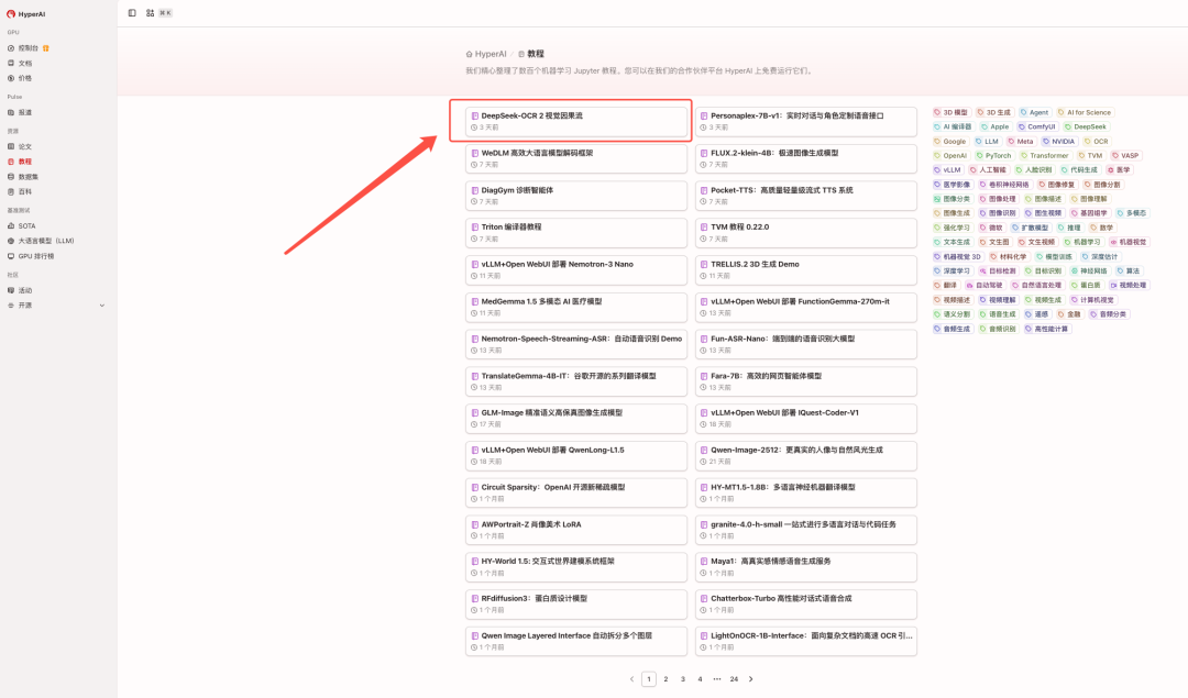 1. 进入 hyper.ai 首页后,选择「教程」页面,或点击「查看更多教程」,选择「DeepSeek-OCR 2 视觉因果流」,点击「在线运行此教程」。