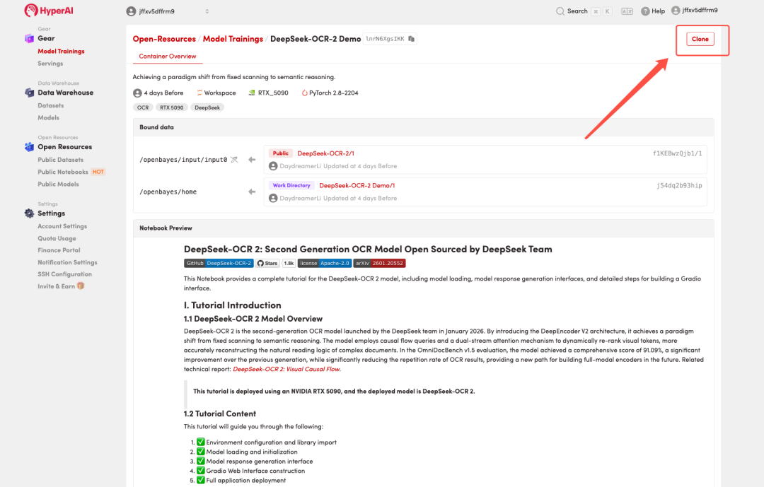 2. 页面跳转后,点击右上角「Clone」,将该教程克隆至自己的容器中。