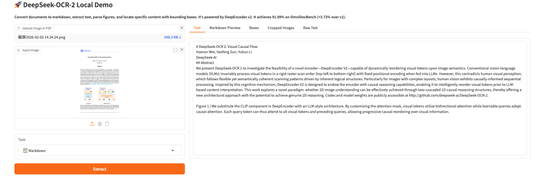 目前,「DeepSeek-OCR 2:视觉因果流」已上线至 HyperAI 超神经官网的「教程」板块,点击下方链接即可体验一键部署教程 ⬇️