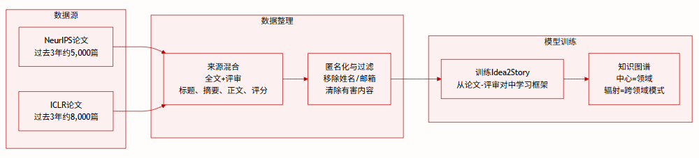 该数据集用于训练 Idea2Story,系统利用论文-评审对学习研究贡献的表述与评估方式,支持可复用方法论模式的检索与组合,而非领域特定内容。