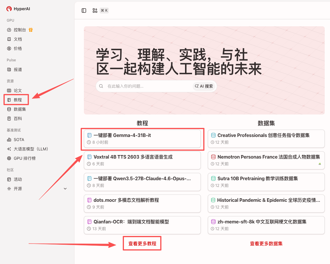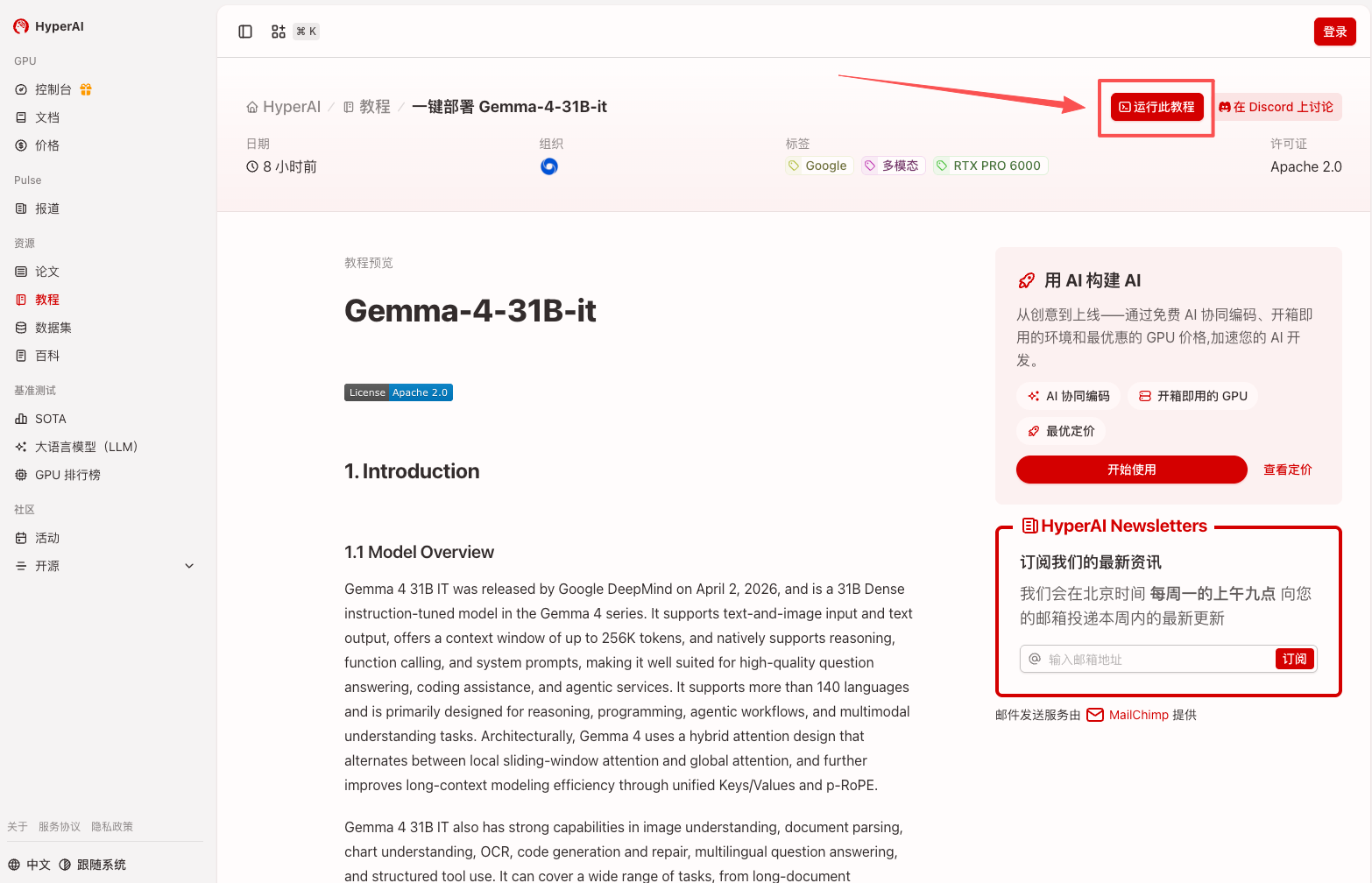 1. 进入 hyper.ai 首页后,选择「教程」页面,或点击「查看更多教程」,选择「一键部署 Gemma-4-31B-it」,点击「运行此教程」。