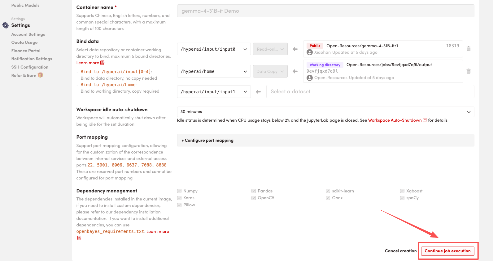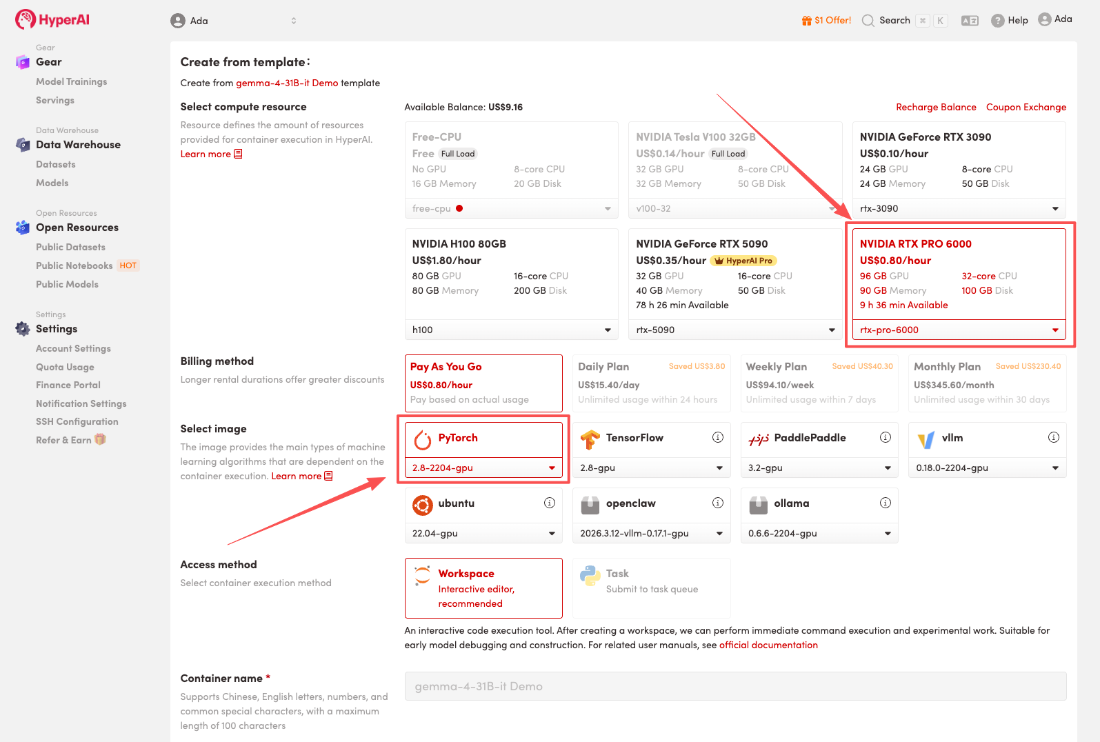 3. 选择「NVIDIA RTX PRO 6000」以及「PyTorch」镜像,点击「Continue job execution(继续执行)」。