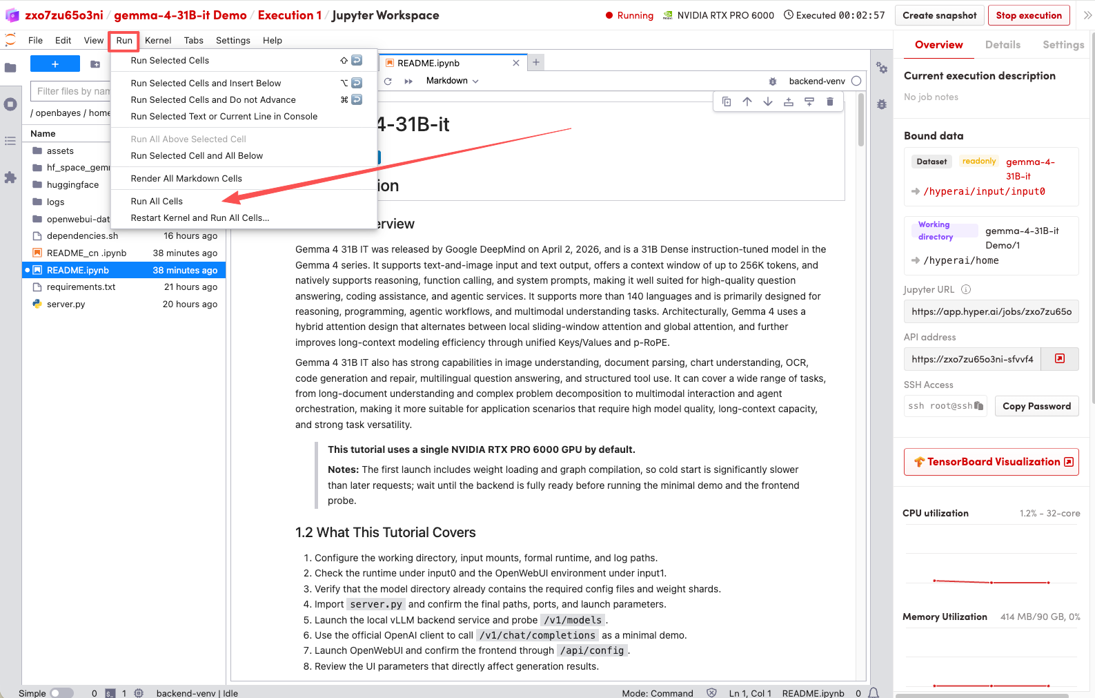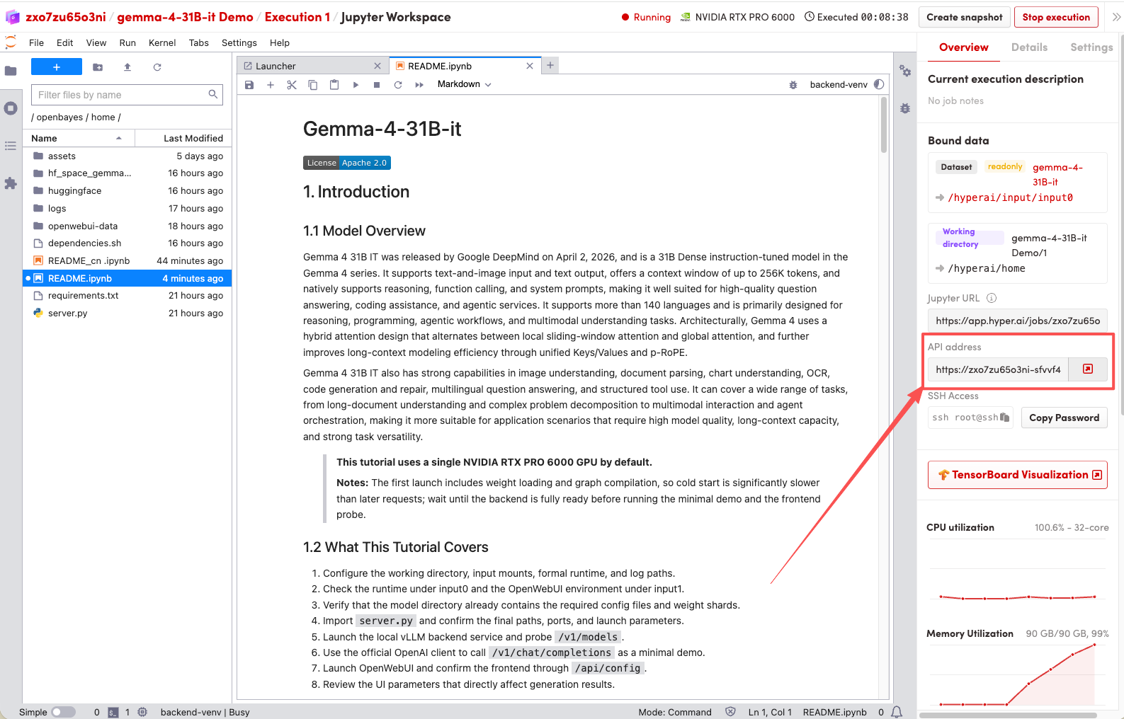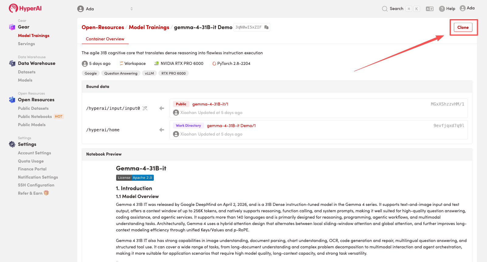 目前,HyperAI 官网(hyper.ai)的教程版块已经上线了「一键部署 Gemma-4-31B-it」,助力开发者低门槛体验先进模型。