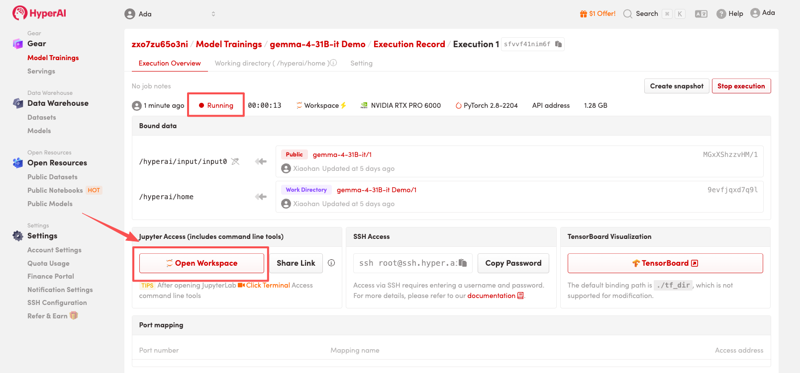4. 等待分配资源,当状态变为「Running(运行中)」后,点击「Open Workspace」进入 Jupyter Workspace 。