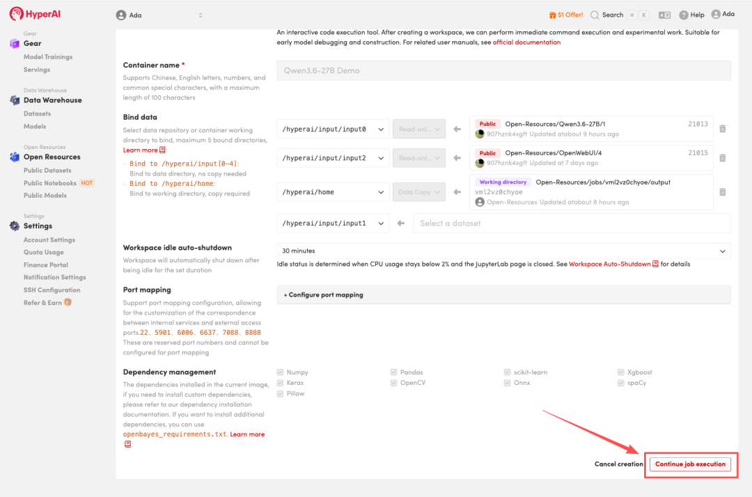 3. 选择「NVIDIA RTX 5090 -4」以及「vLLM」镜像,点击「Continue job execution(继续执行)」。