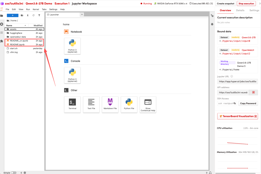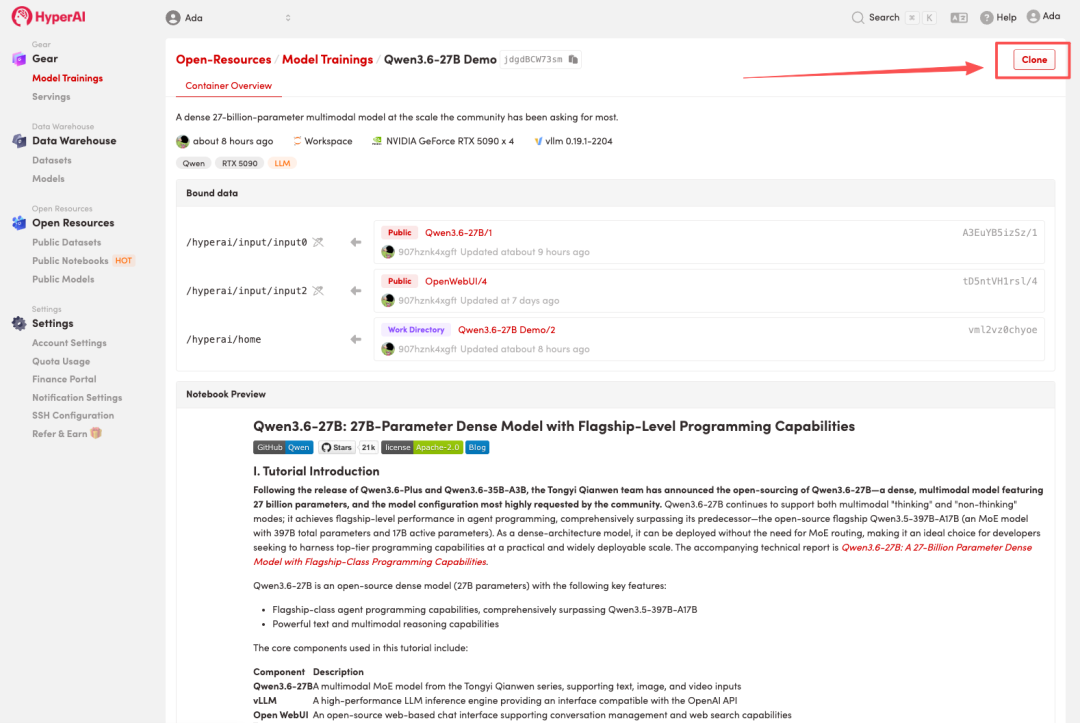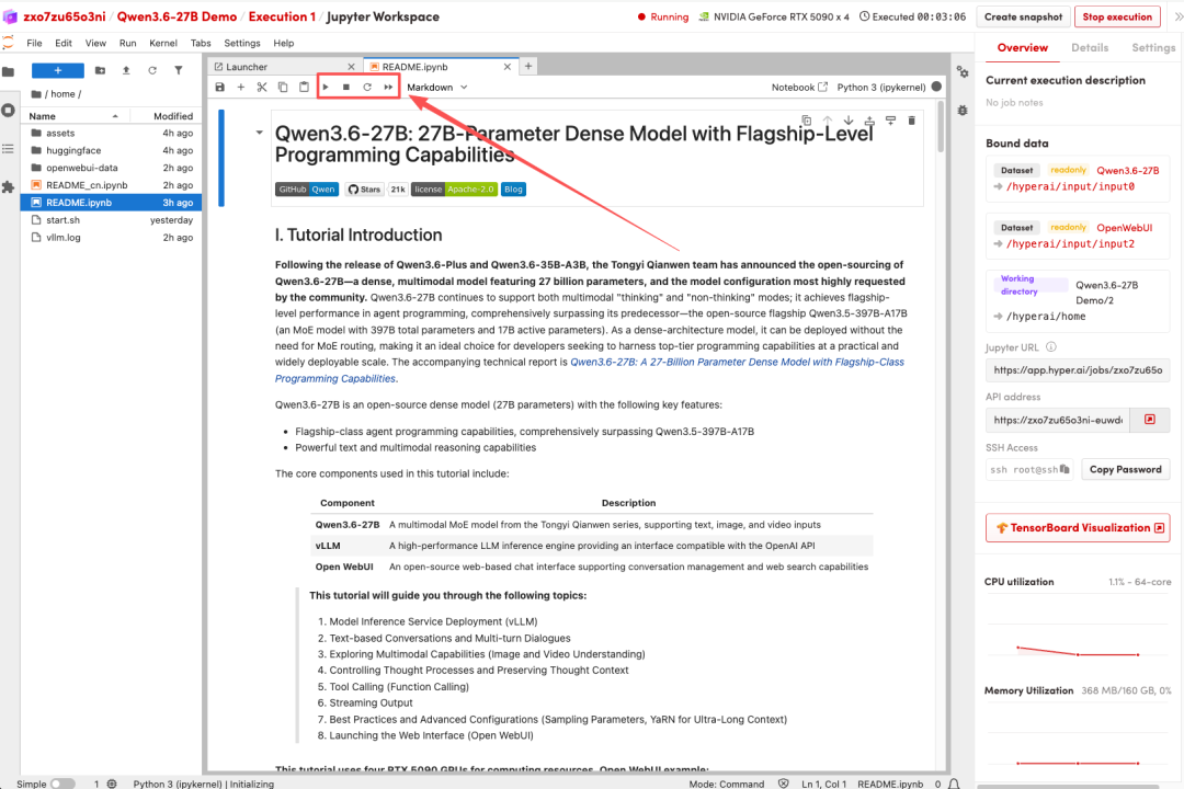 目前,HyperAI 官网(hyper.ai)的教程板块已经上线了「一键部署 Qwen3.6-27B」,完成环境配置,助力快速验证热门开源模型!