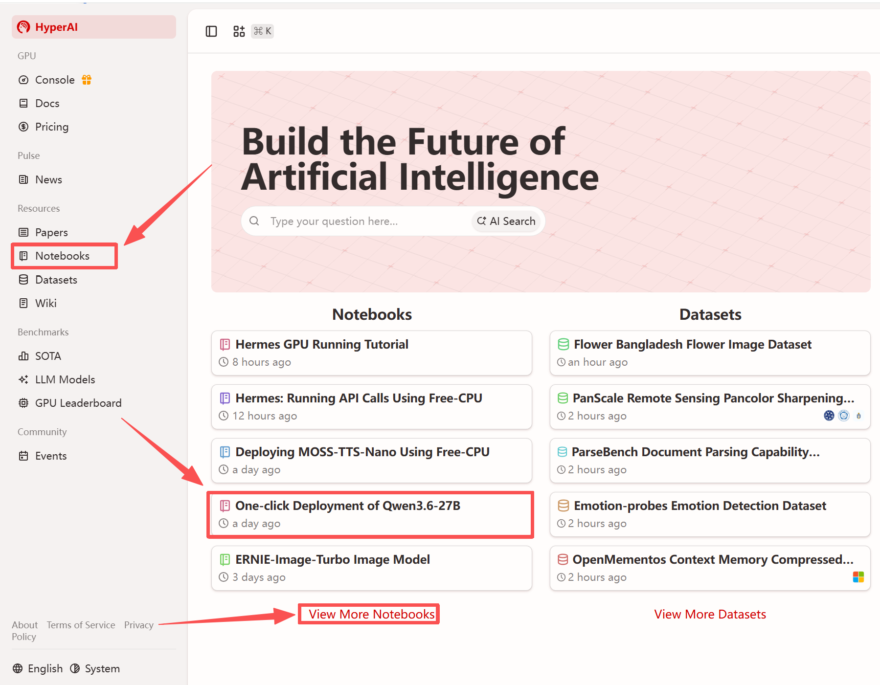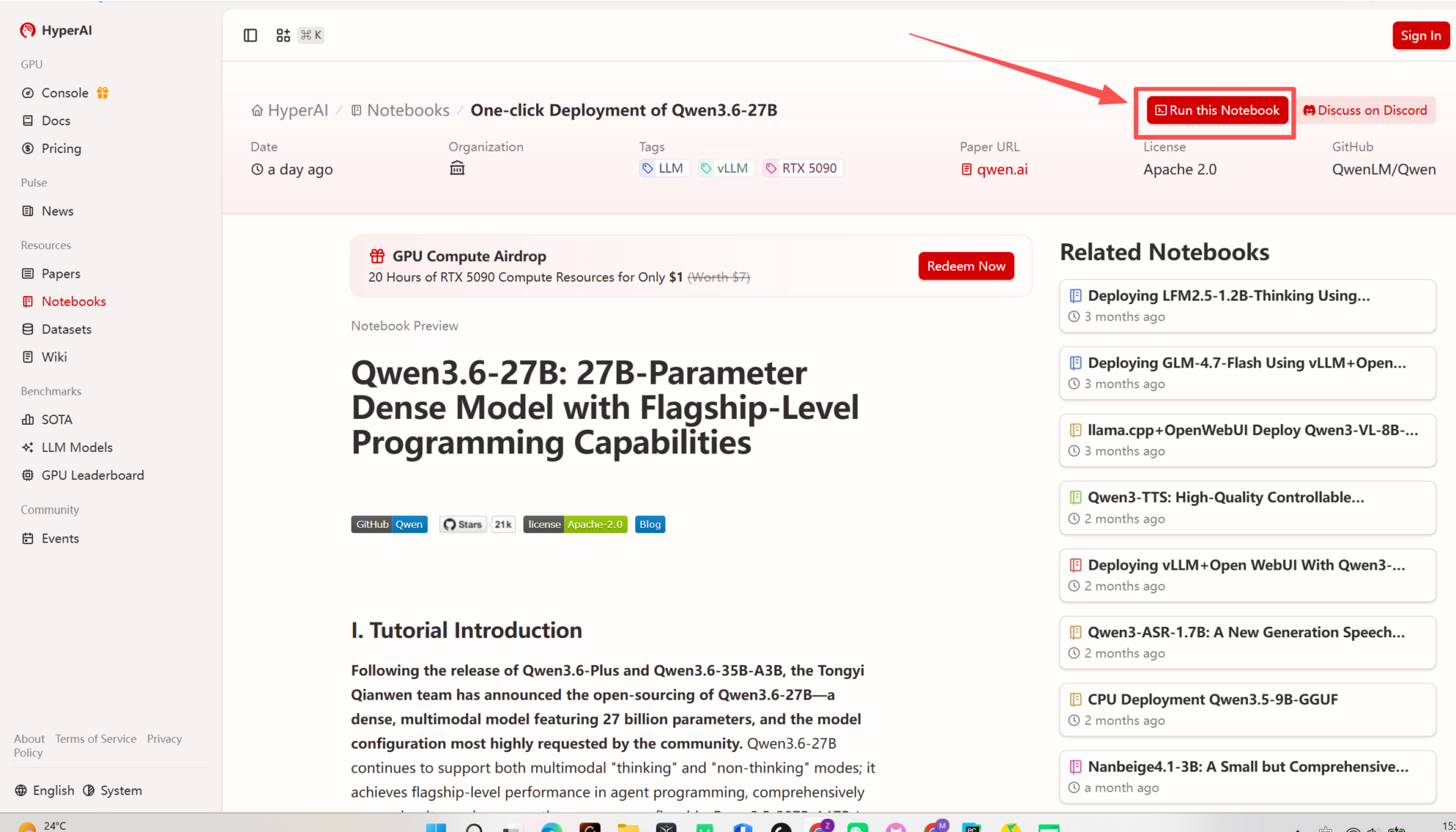 1. 进入 hyper.ai 首页后,选择「教程」页面,或点击「查看更多教程」,选择「一键部署 Qwen3.6-27B」,点击「运行此教程」。