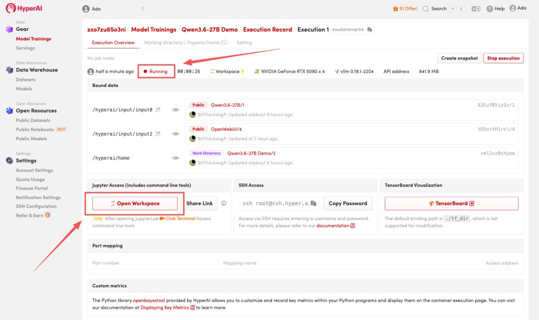 4. 等待分配资源,当状态变为「Running(运行中)」后,点击「Open Workspace」进入 Jupyter Workspace 。