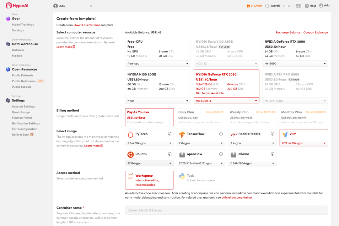 HyperAI 为新用户准备了注册福利,仅需 $1,即可获得 20 小时 RTX 5090 算力(原价 $7),资源永久有效。