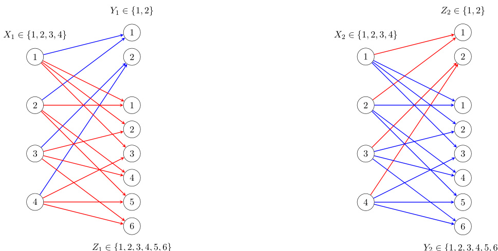 该图展示了两个分量信道。在左侧分量中,从输入 X1 到输出 Y1 的映射是确定性的(蓝色边),而到 Z1 的映射是随机的(红色边)。在右侧分量中,这种关系相反:从 X2 到 Z2 的映射是确定性的(红色边),而到 Y2 的映射是随机的(蓝色边)。这种“反向”半确定性结构对于所提出的理论结果至关重要。