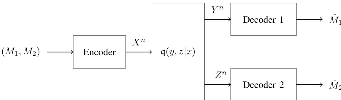在此设置中,编码器将一对私有消息 (M1,M2) 映射为码字 Xn。该信号通过由转移概率 q(y,z∣x) 定义的广播信道进行传输。信道生成两个不同的输出 Yn 和 Zn,分别由解码器 1 和解码器 2 处理,以产生消息估计 M^1 和 M^2。主要目标是刻画该系统可达速率对 (R1,R2) 的集合。