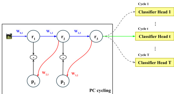 该架构采用 T 个不同的分类器,而不是所有循环共享单个分类器。这一决定是由迭代过程中特征表示的演变性质驱动的。由于特征向量从一个循环到下一个循环不断细化,在五个循环模型上训练的分类器将无法准确解释同一输入下一个循环模型提取的模式。