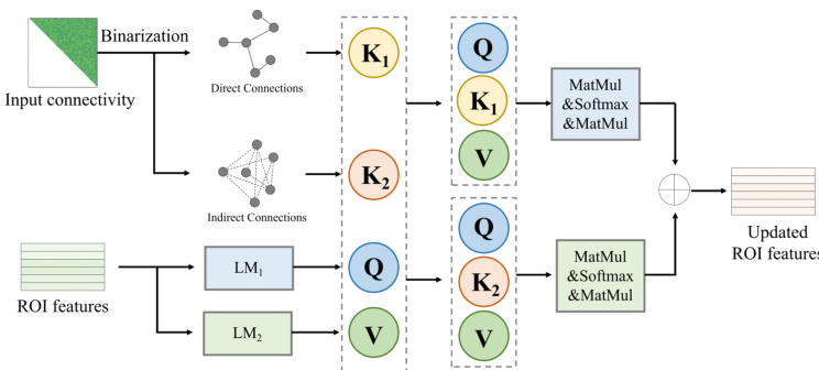 该模块计算查询(Q)、键(K1,K2)和值(V)向量,其中 K1 和 K2 代表由单层 GCN 导出的直接和间接连接的 ROI 特征。注意力值分别针对直接和间接连接计算,并组合起来更新 ROI 特征。在注意力机制之后,后验计算模块(PCD)将特征转换为对称模糊的 A˙0,并通过后验采样预测当前步骤的噪声 SC。