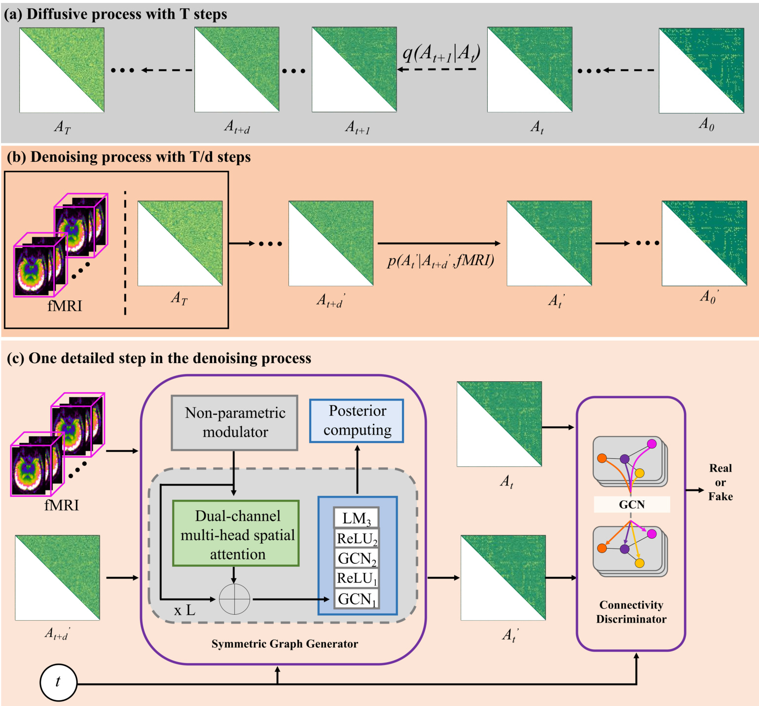 建模由 fMRI 衍生的功能连接与结构连接之间的关系,对于揭示阿尔茨海默病等神经退行性疾病的病理机制至关重要。先前的方法通常依赖于低效的两阶段流程,即先计算功能连接再预测结构,同时面临生成模型训练不稳定和模式崩溃的问题。作者利用一种名为 DiffGAN-F2S 的新型对称扩散生成对抗网络,在统一的端到端框架中直接从 fMRI 预测结构连接。通过整合去噪扩散概率模型、对抗学习以及双通道多头空间注意力机制,该方法在保留关键的全局和局部拓扑信息的同时,高效地生成了高保真的对称图。