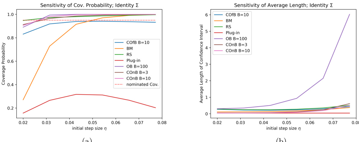 - 敏感性分析证实,所提方法无论初始步长如何都能保持稳定的覆盖概率,而批量均值方法需要仔细调整,Delta 方法在步长变化时无法提供有效区间。
