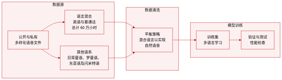 - 英语和普通话: 作为主要组成部分,每种语言分配了 300,000 小时。
