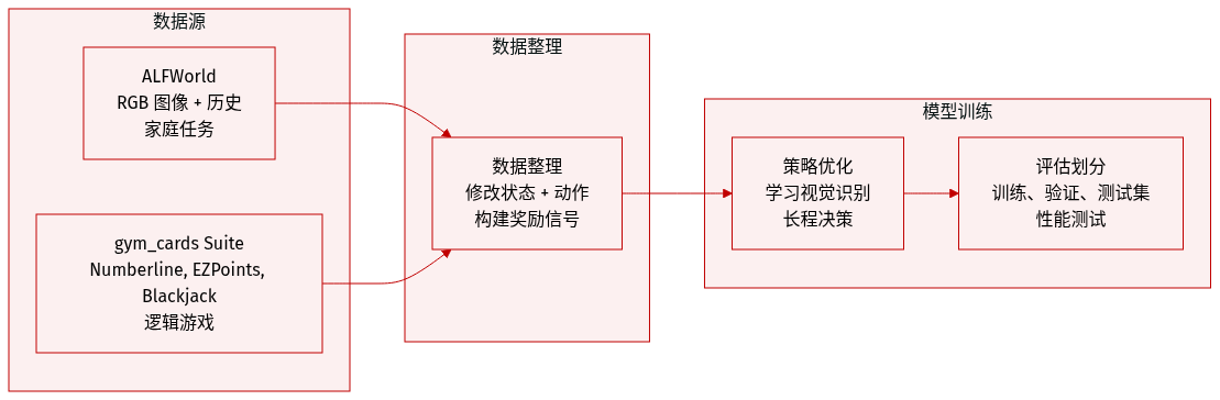 - 作者利用两个仿真环境进行数据生成:ALFWorld 用于具身家庭任务,gym_cards 套件用于更简单的逻辑游戏。