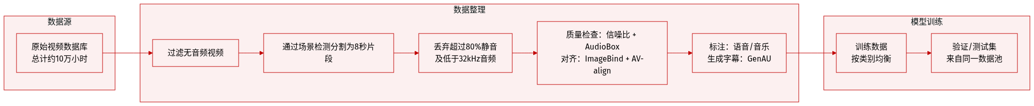 通过多阶段过滤管道从原始视频数据库构建。最终数据集包含约 10 万小时的文本-视频-音频材料。 -