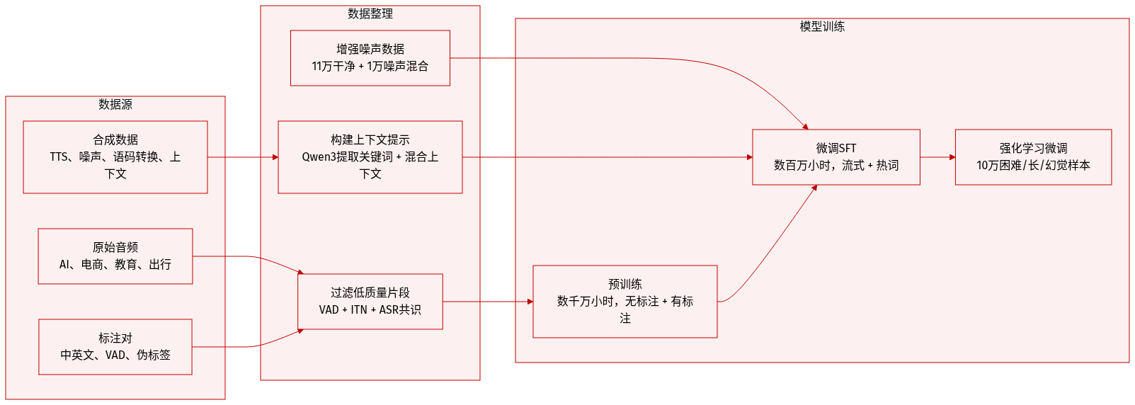 用于监督微调(SFT),他们整合了数百万小时的人工转录、伪标注、环境噪声、TTS合成(CosyVoice3)、模拟流式、噪声增强及热词定制数据。