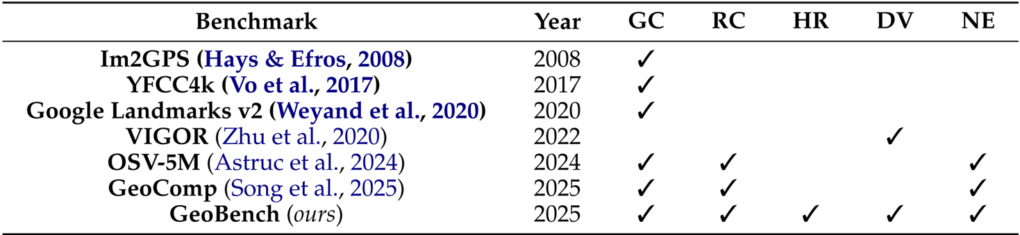 - 构建高难度基准GeoBench:作者推出了包含高分辨率照片和全景图的全球覆盖基准测试集,剔除了易识别地标和不可定位样本,支持分级与细粒度的评估,填补了高难度真实场景评测的空白。