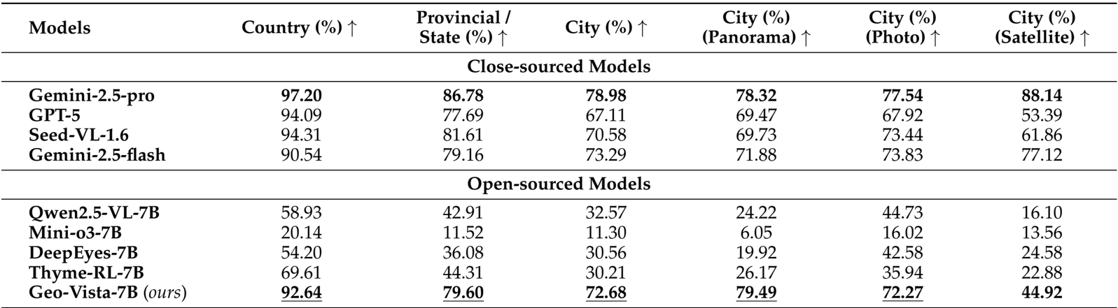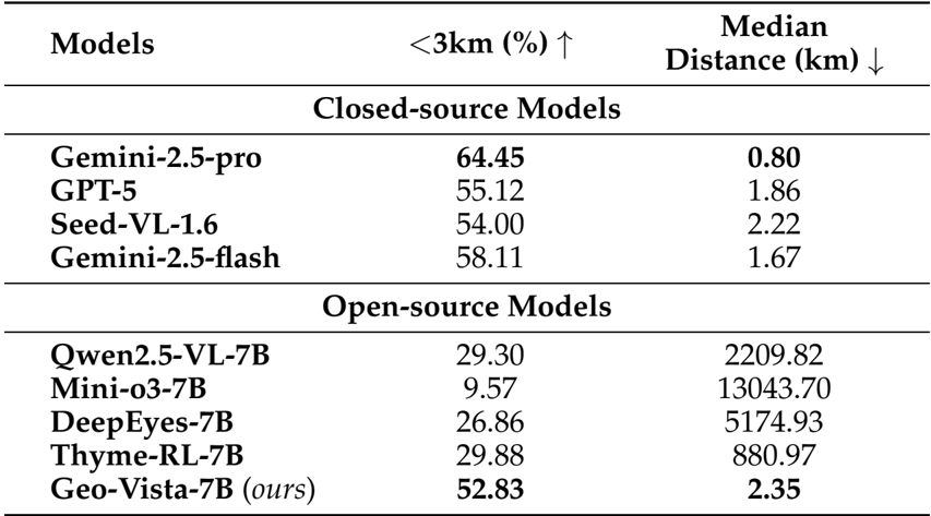 - 核心性能指标:GeoVista在GeoBench各项指标上均取得了开源模型中的SOTA性能(如国家级准确率92.64%,市级准确率72.68%),在多数指标上与闭源模型能力相当;在细粒度评估中,其预测位置与真实位置距离小于3km的比例达到52.83%,中位距离仅为2.35km,显著优于中位距离数千公里的其他同量级开源模型。