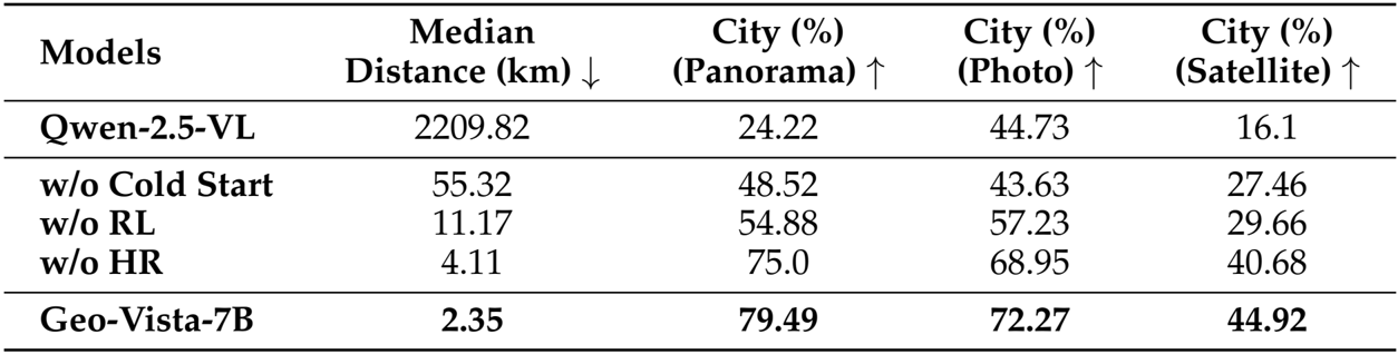 作者通过消融实验验证了不同训练组件对模型性能的影响,结果显示,移除冷启动微调(SFT)会导致模型在GeoBench上的性能崩溃,表明冷启动SFT对于多轮工具调用至关重要;移除强化学习(RL)后,模型性能显著下降,说明仅靠SFT无法充分激发模型的推理能力;而移除分层奖励(HR)后,模型在城市级准确率和中位距离上均出现明显退化,进一步证明了分层奖励机制在提升模型定位精度中的关键作用。
