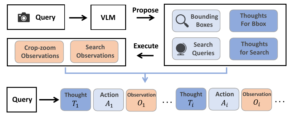 该框架中,策略模型可调用两种类型的工具:一是“裁剪-放大”工具,模型输出一个由bbox_2d参数化的边界框,用于裁剪并放大感兴趣的区域,观测结果即为放大后的子图;二是“网络搜索”工具,模型生成一个网络搜索查询,从互联网检索最多10个相关信息源,观测结果为包含网页URL的文本文档。见框架图